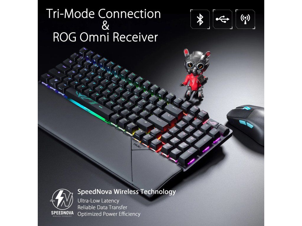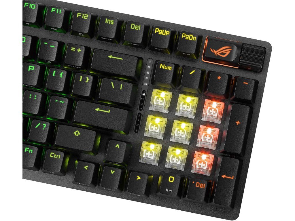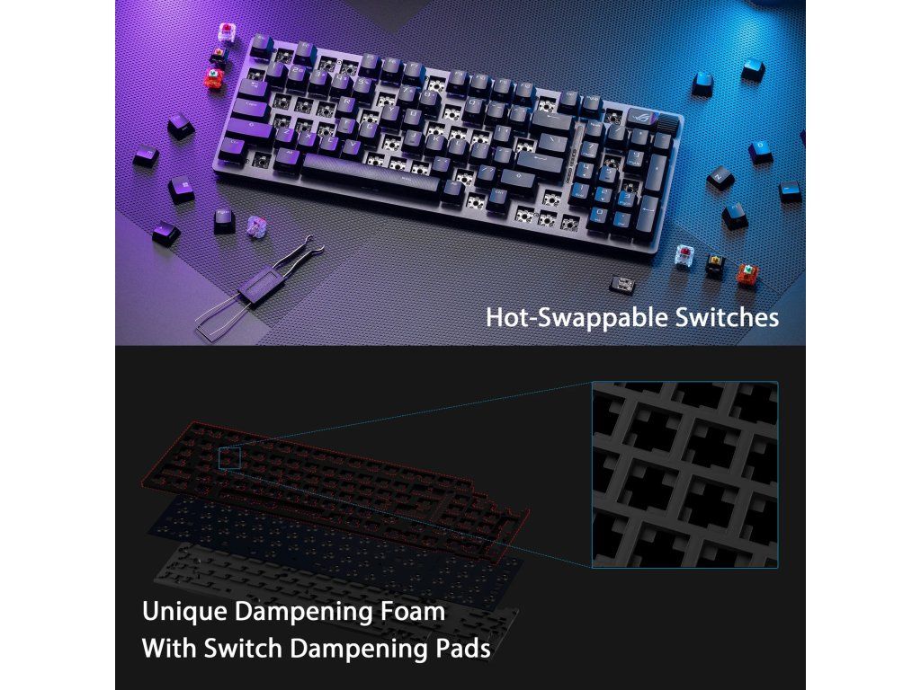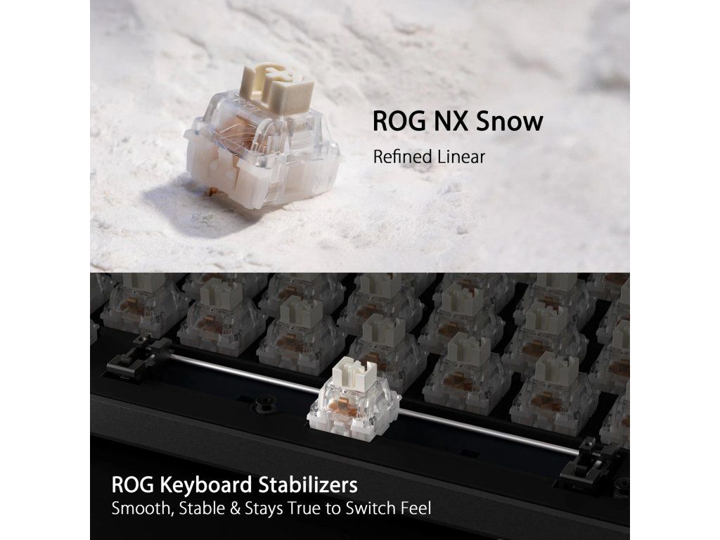 Klávesnice využívá ROG NX Snow lineární spínače, které jsou předem lubrikované pro maximálně hladký chod a tichý, rychlý stisk. Konstrukce s gasket mount a tlumicí pěnou výrazně zlepšuje akustiku i celkový pocit ze psaní.