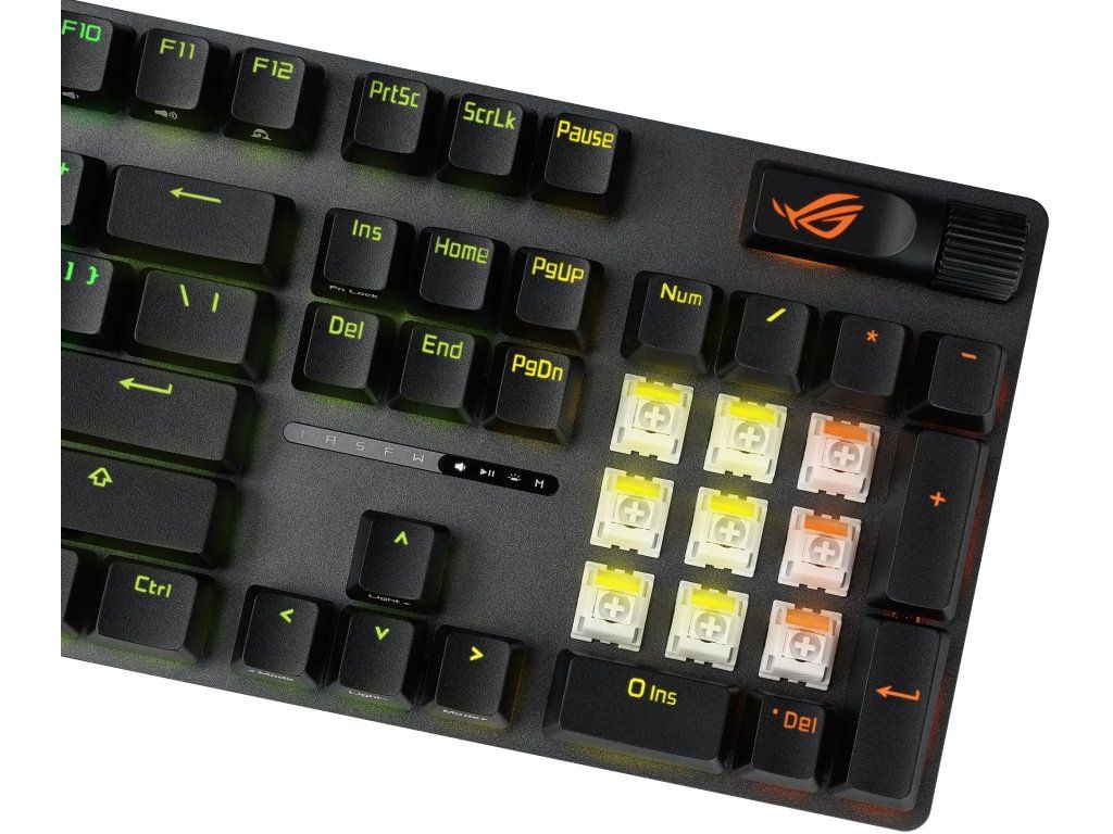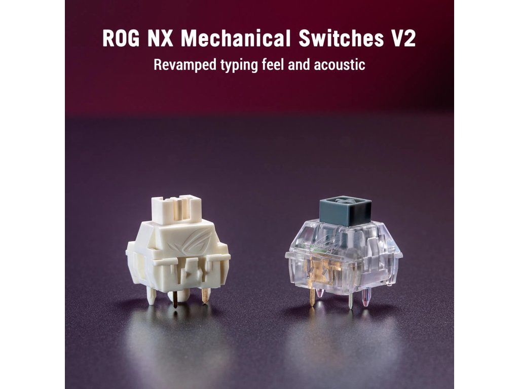 - Spínače: ROG NX Snow V2 (lineární, předem lubrikované)