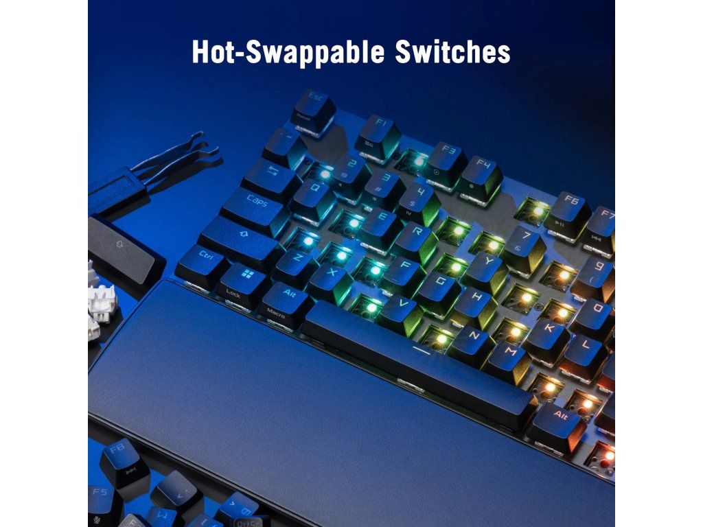 Díky hot-swap konstrukci lze spínače snadno měnit bez pájení, což umožňuje plné přizpůsobení podle preferencí. Klávesnice je vybavena PBT doubleshot keycaps, které jsou odolné proti opotřebení a neztrácí popisky ani po dlouhodobém používání.