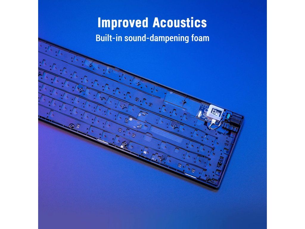Integrovaná tlumicí pěna zlepšuje akustiku a eliminuje nežádoucí zvuky, zatímco Aura Sync RGB podsvícení umožňuje detailní nastavení vzhledu.
