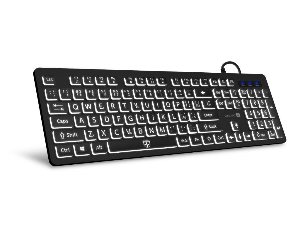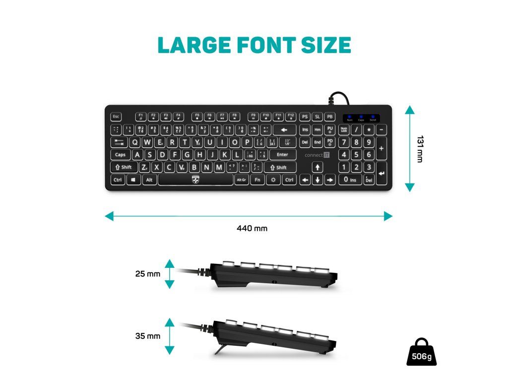 CONNECT IT FOR HEALTH LargeFont je speciálně navržená klávesnice s velkými znaky a bílým LED podsvícením, která zajišťuje maximální čitelnost při práci. Je ideální volbou pro seniory, děti nebo uživatele se zhoršeným zrakem.