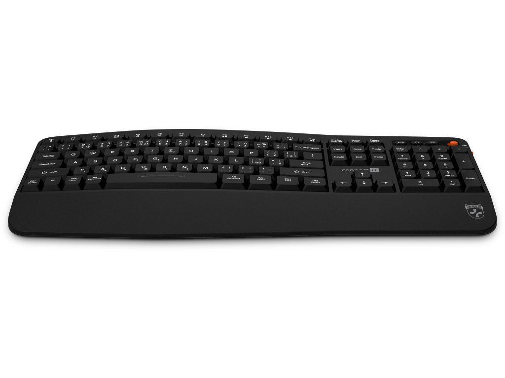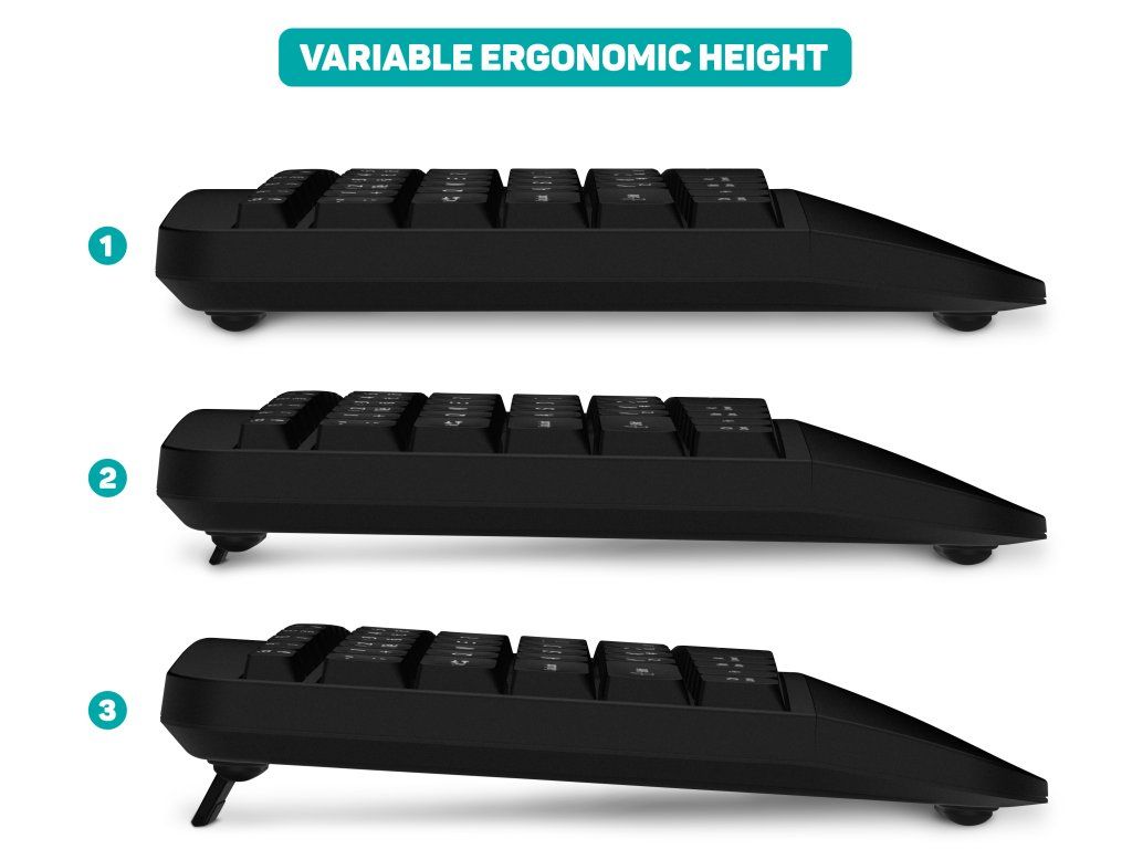 Klávesnice nabízí ergonomický tvar a 3polohový náklon, který zlepšuje pozici rukou při psaní. K dispozici je také 13 multimediálních a funkčních kláves pro snadné ovládání systému.