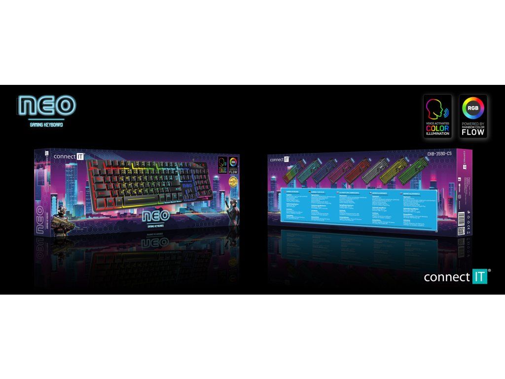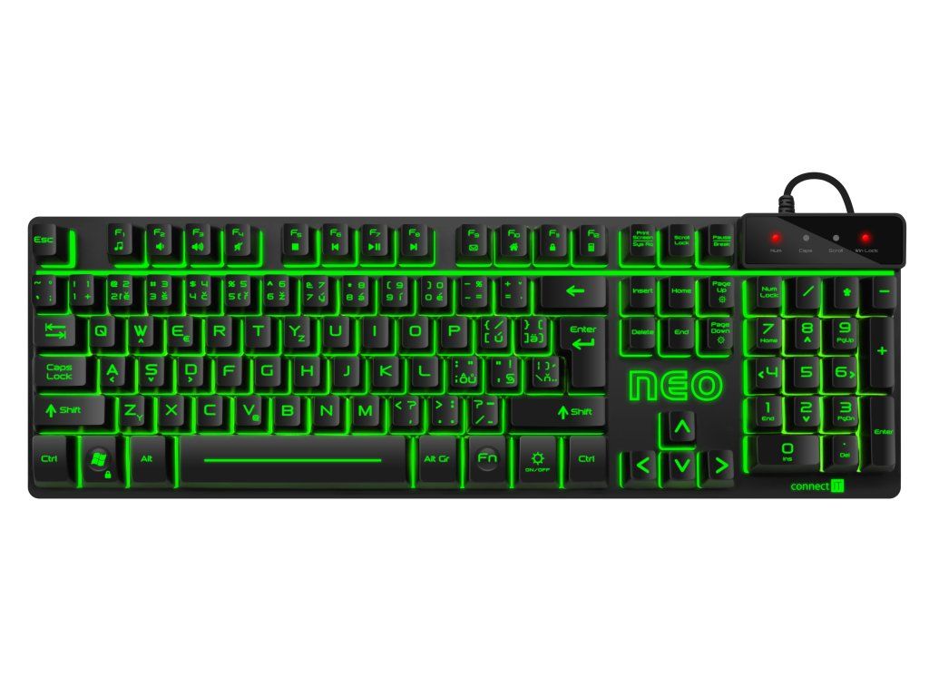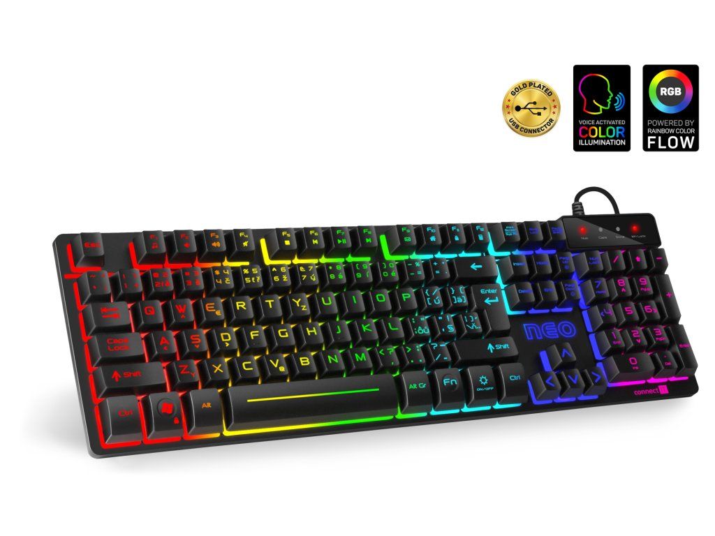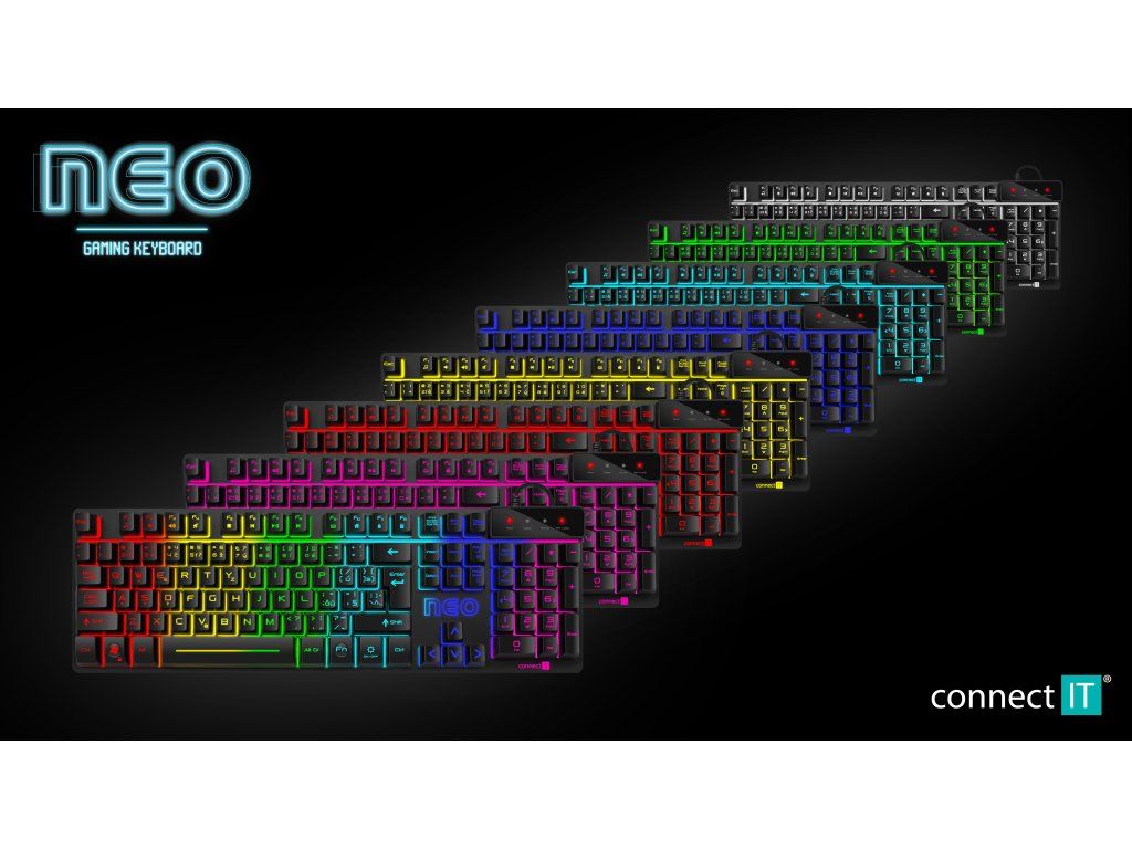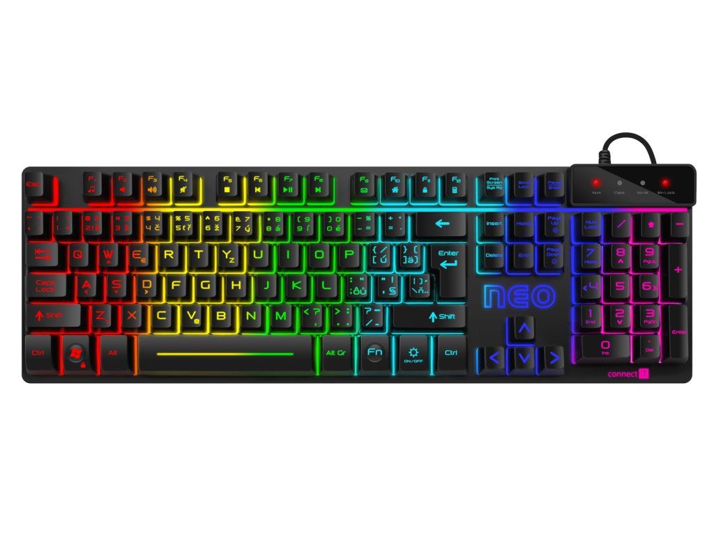 CONNECT IT Neo Pro Gaming (CKB-3590-CS) je herní klávesnice navržená pro hráče, kteří chtějí spolehlivý výkon, efektní RGB podsvícení a plnou kontrolu nad ovládáním. Nabízí klasické rozložení kláves s českým a slovenským layoutem a okamžitou funkčnost díky plug & play připojení.