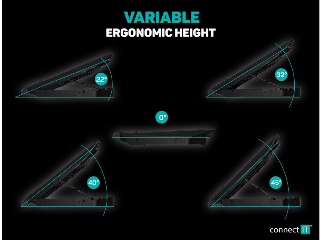 Díky 5 úrovním nastavení sklonu (až cca 45°) si můžete přizpůsobit ergonomii podle svých potřeb. Protiskluzové prvky zajišťují stabilitu notebooku při používání.