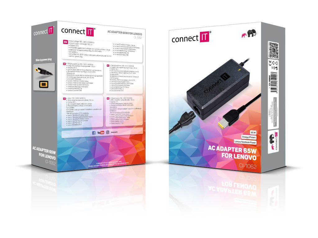 CONNECT IT Notebook Power Lenovo 65W (Slim Tip) je univerzální napájecí adaptér určený pro notebooky Lenovo vybavené obdélníkovým konektorem Slim Tip. Poskytuje stabilní výkon 65 W a je vhodný jako plnohodnotná náhrada za originální adaptér.