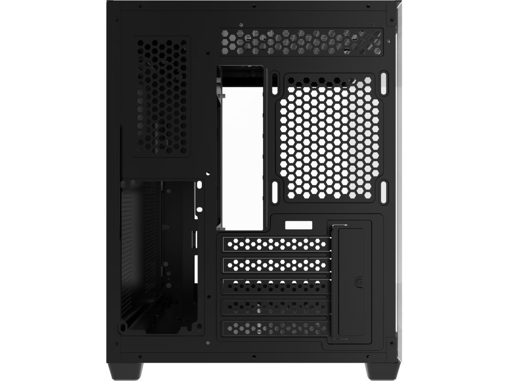 Interiér je navržen tak, aby pojmul grafické karty až do délky 413 mm a procesorové chladiče do 160 mm. Nechybí také dostatek místa pro cable management a praktické průchodky, které pomáhají udržovat čistý vzhled sestavy a efektivní proudění vzduchu.