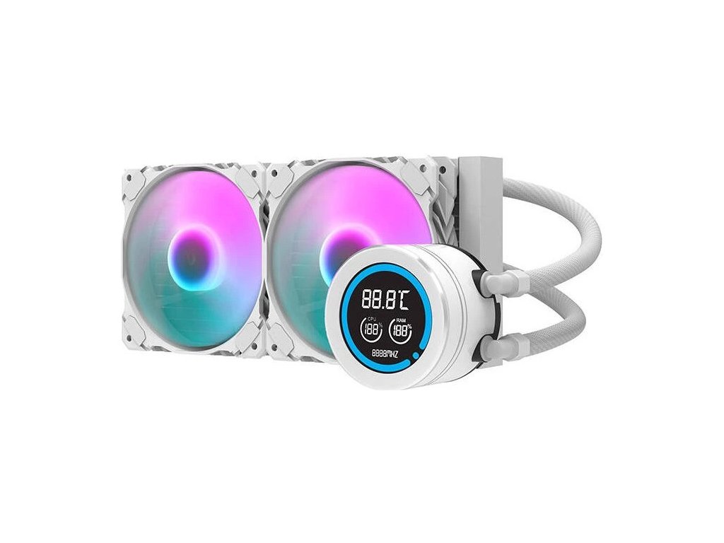 darkFlash DN-D240 White je výkonné a esteticky působivé AIO vodní chlazení s 240mm hliníkovým radiátorem a dvěma 120mm PWM ventilátory s ARGB podsvícením. Pumpa i ventilátory disponují synchronizovatelným RGB osvětlením, které lze propojit se základní deskou (5V ARGB 3pin).