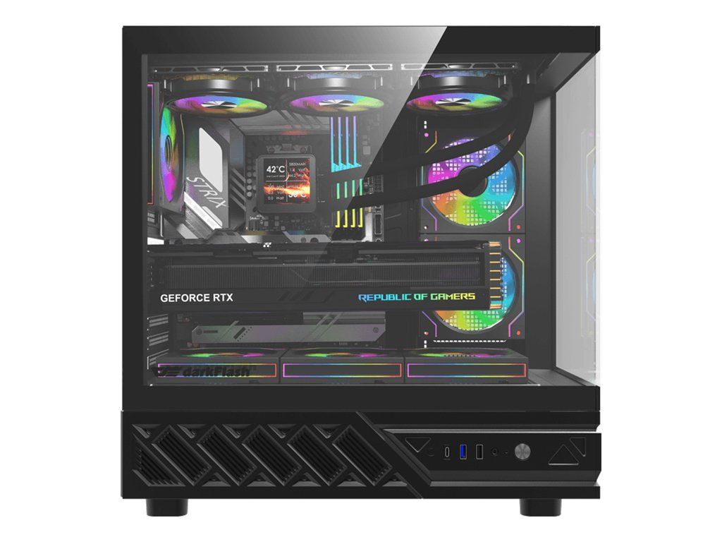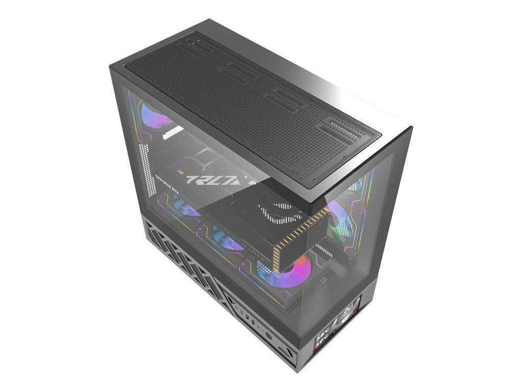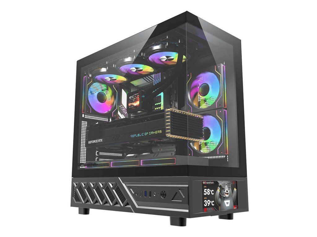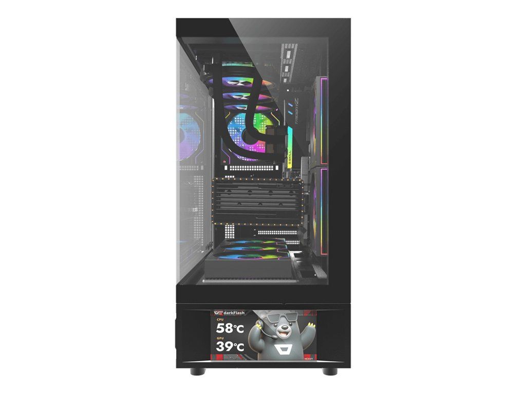 DarkFlash DS950V with screen je moderní počítačová skříň navržená pro uživatele, kteří chtějí spojit výrazný vzhled, přehledně vystavené komponenty a široké možnosti chlazení. Panoramatická konstrukce se dvěma panely z tvrzeného skla nabízí 270° pohled do interiéru a integrovaný 6" IPS displej umožňuje zobrazovat systémové informace nebo vlastní obsah, čímž dodává celé sestavě osobitý charakter.