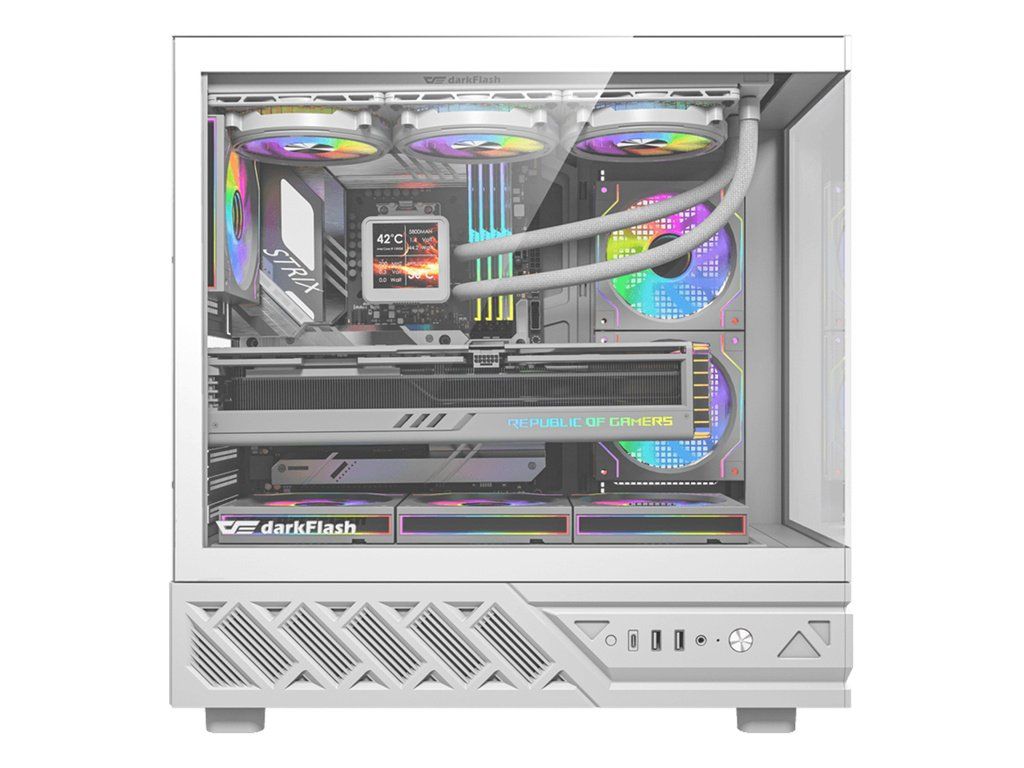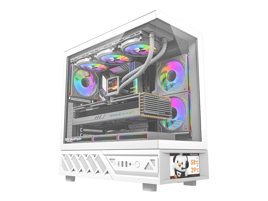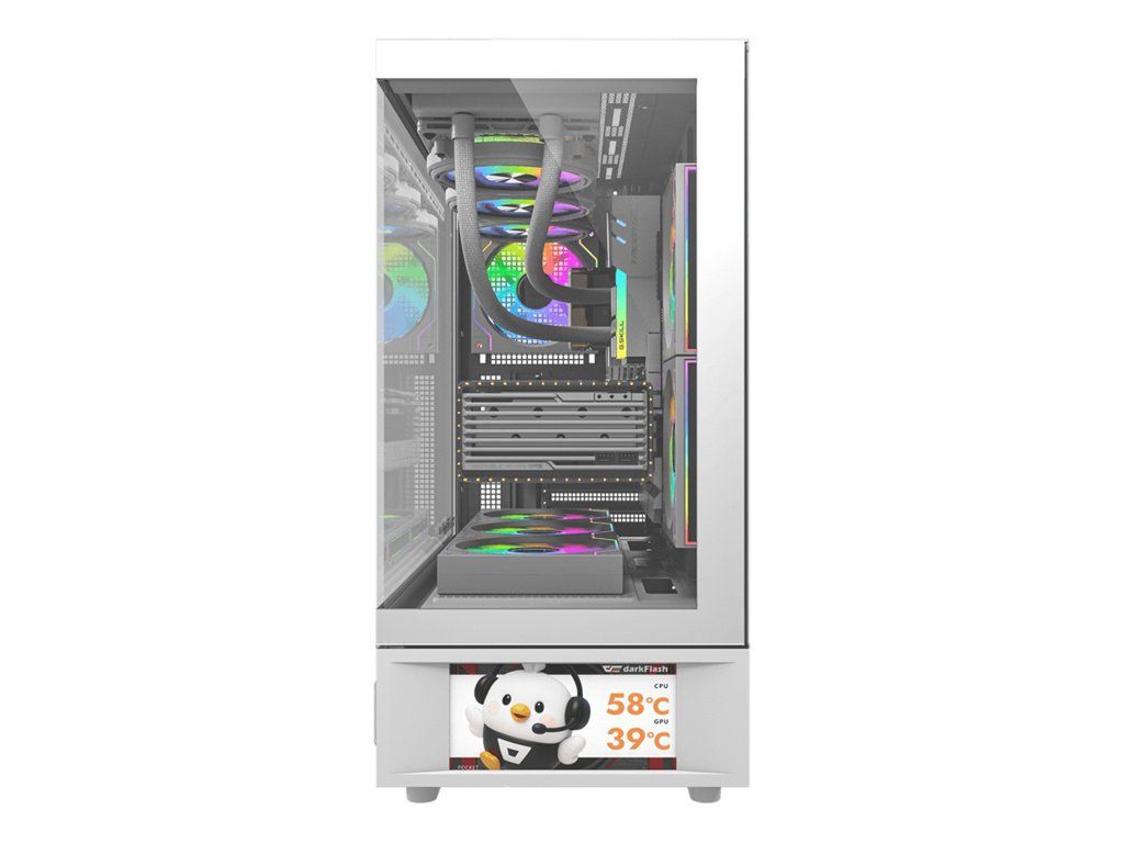 DarkFlash DS950V with screen je moderní počítačová skříň navržená pro uživatele, kteří chtějí spojit výrazný vzhled, přehledně vystavené komponenty a široké možnosti chlazení. Panoramatická konstrukce se dvěma panely z tvrzeného skla nabízí 270° pohled do interiéru a integrovaný 6" IPS displej umožňuje zobrazovat systémové informace nebo vlastní obsah, čímž dodává celé sestavě osobitý charakter.