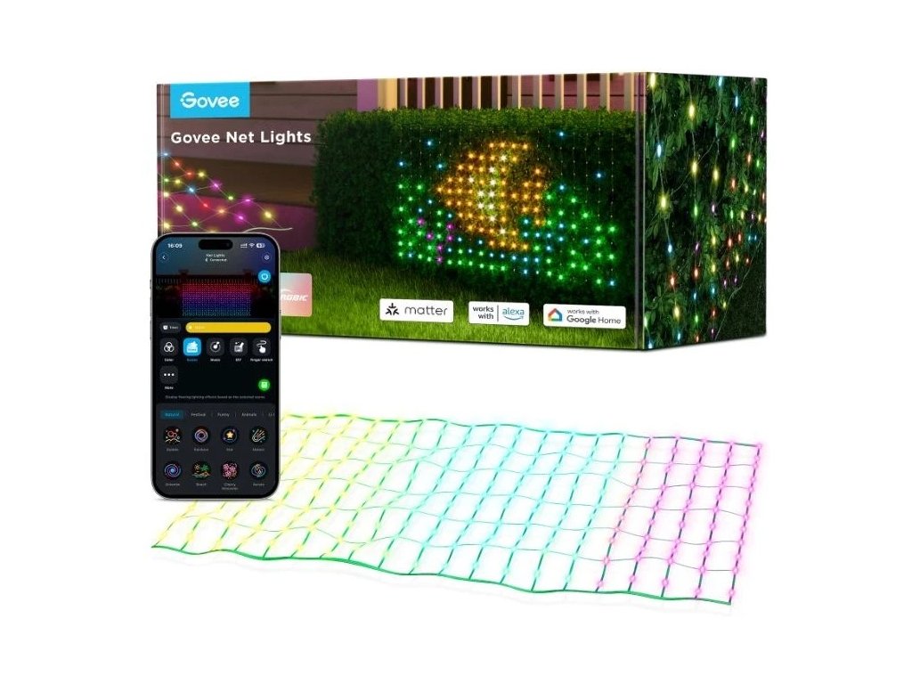 Ovládání probíhá jednoduše přes aplikaci Govee Home v telefonu (Android/iOS), nebo hlasem přes Amazon Alexa a Google Assistant. Síť je odolná proti vodě (IP65), ideální na venkovní i vnitřní použití. Možnost synchronizace s hudbou, časovač, plánování scén i desítky dynamických efektů. Instalace je snadná a rychlá – stačí rozložit a zavěsit na vybrané místo.