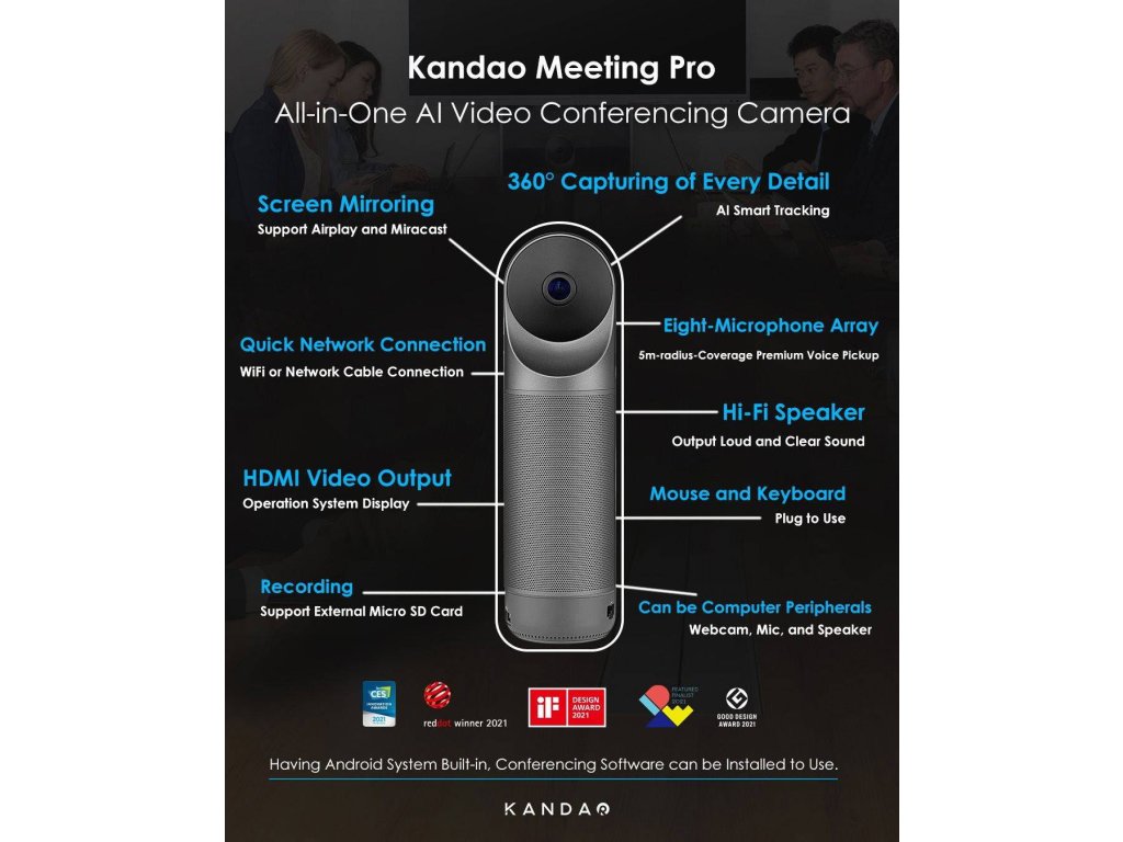 Kandao Meeting Pro kombinuje 360° kameru, 8 všesměrových mikrofonů, Hi-Fi reproduktor a vestavěný Android systém. Díky tomu umožňuje samostatné fungování bez potřeby externího počítače – stačí připojit k displeji přes HDMI.