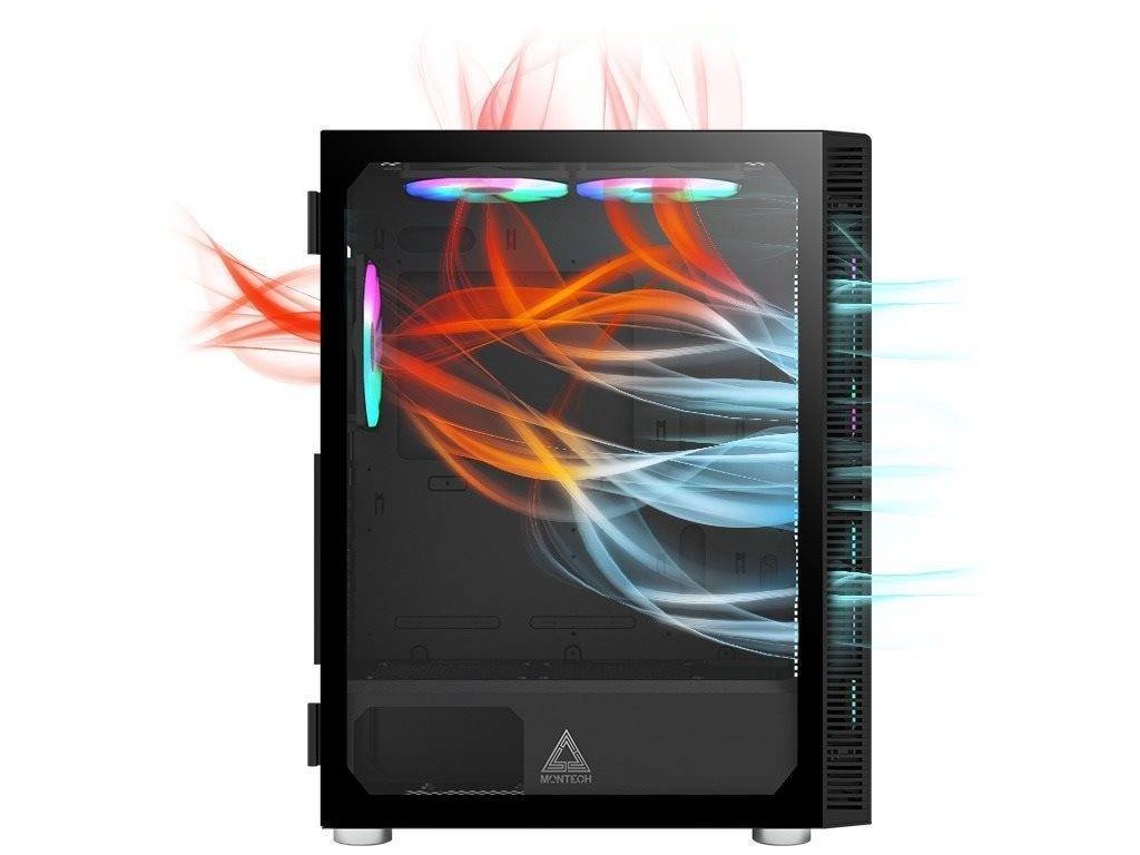 Skříň Montech X3 Mesh v černém provedení nabízí vysoký průtok vzduchu díky celoplošnému mesh přednímu panelu a šesti dodávaným ventilátorům. Tři 140mm ventilátory vpředu a tři 120mm ventilátory (dva nahoře, jeden vzadu) poskytují výkonné chlazení hned po vybalení.