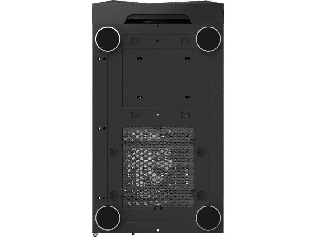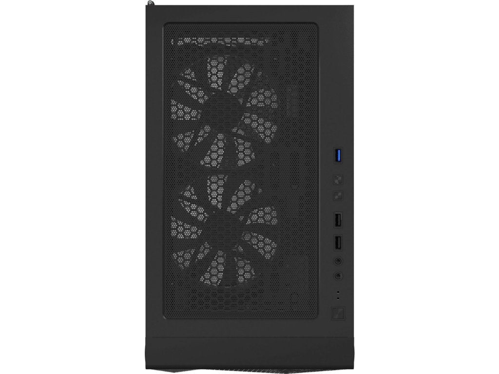 Horní I/O panel nabízí 1× USB 3.0, 2× USB 2.0, kombinovaný audio port, tlačítka Power a Reset a LED ovladač. Prachové filtry na horní i spodní straně usnadňují údržbu a udržují vnitřek skříně čistý.