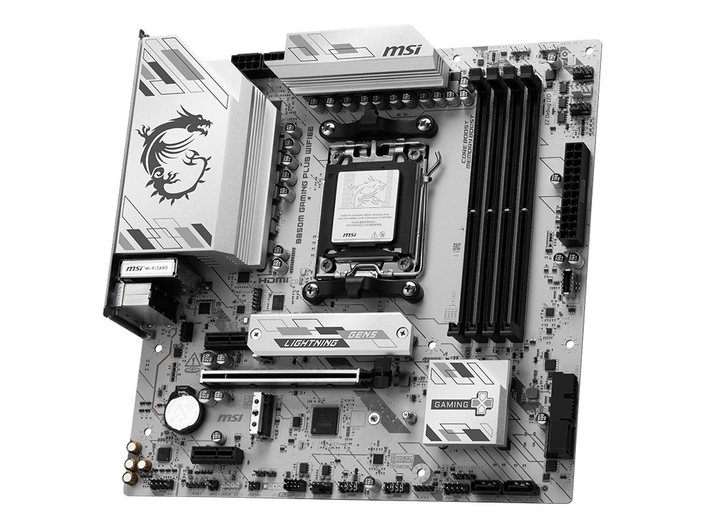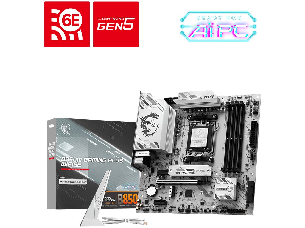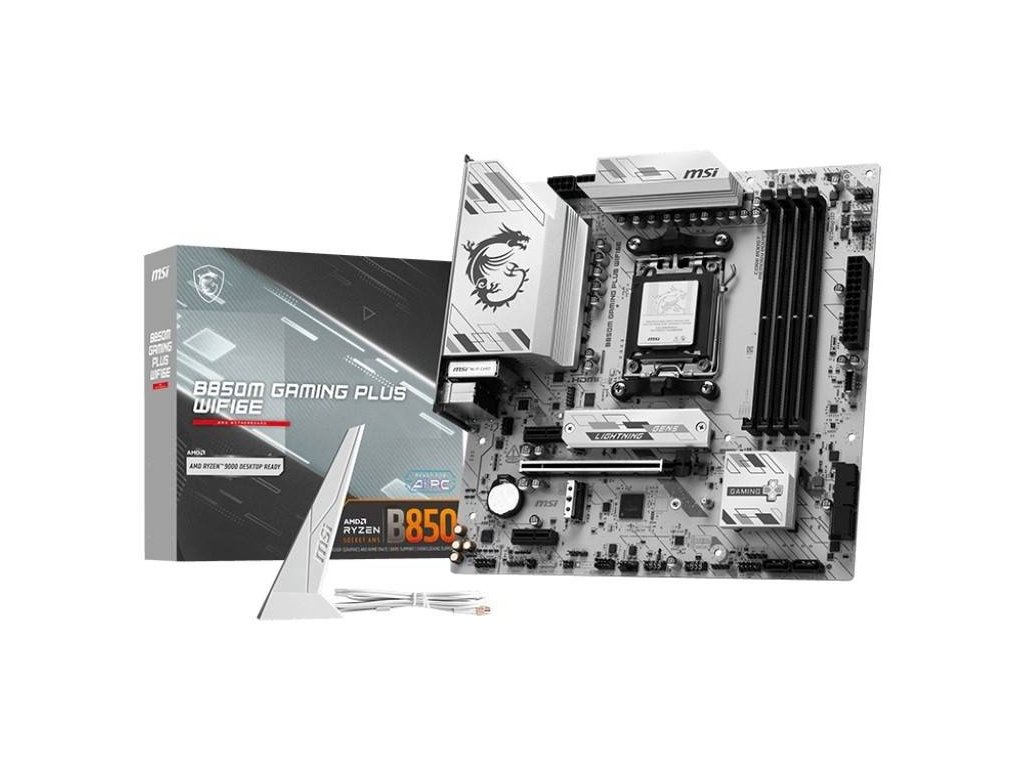 MSI B850M GAMING PLUS WIFI6E je herní micro ATX základní deska postavená na čipsetu AMD B850, navržená pro stabilní výkon, rychlé připojení a bohatou konektivitu v kompaktním formátu. Podporuje nejnovější desktopové procesory AMD Ryzen™ řad 7000, 8000 a 9000 v patici AM5 a využívá čtyři DDR5 sloty s podporou až 256 GB paměti a vysokých frekvencí až do DDR5 8200+ MT/s (OC). Deska podporuje PCIe 5.0 pro moderní NVMe SSD a nabízí silné síťové funkce včetně Wi-Fi 6E a 2,5 Gb/s LAN pro rychlé datové přenosy.