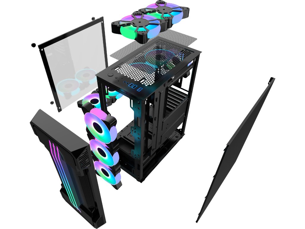 Konstrukce skříně je vyrobena z kvalitní oceli a doplněna bočním panelem z tvrzeného skla, který umožňuje přehledný pohled na vnitřní komponenty. Ovládání RGB podsvícení je řešeno pomocí přiloženého dálkového ovladače, což umožňuje snadnou změnu barev a efektů bez nutnosti softwaru.
