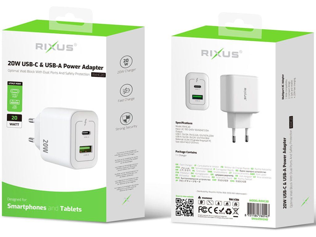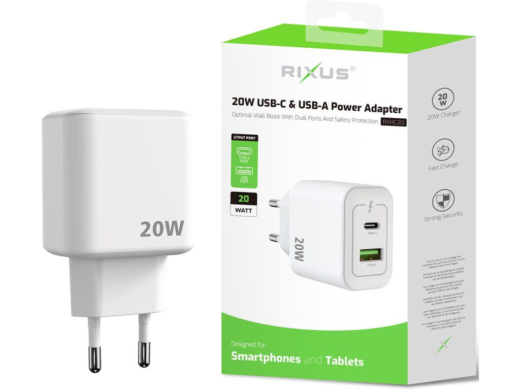 Rixus RXHC20 20W USB-C, USB-A Charger je praktická síťová nabíječka určená pro uživatele, kteří chtějí nabíjet moderní zařízení přes USB-C i starší příslušenství přes USB-A. Díky dvojici výstupů nabízí univerzálnější použití a kompaktní konstrukce usnadňuje každodenní přenášení.