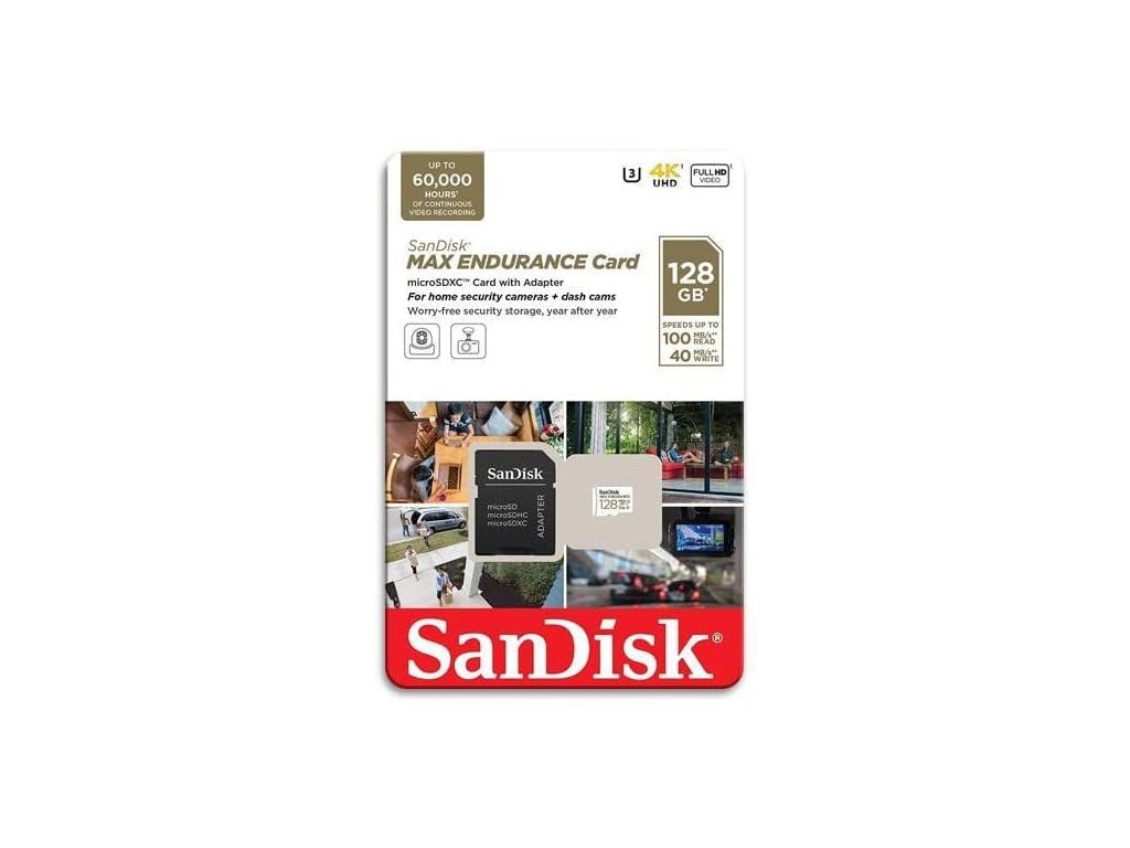 SanDisk microSDXC 128GB MAX Endurance + SD adapter je paměťová karta formátu microSDXC s rozhraním UHS-I určená pro zařízení s nepřetržitým nebo častým záznamem. Je optimalizovaná pro dlouhou životnost při opakovaném přepisování dat, což ji předurčuje pro použití v autokamerách, domácích bezpečnostních systémech a monitorovacích kamerách.