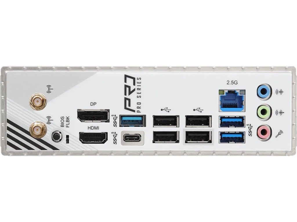 Sieťové pripojenie zabezpečuje 2.5Gb Ethernet a integrované Wi-Fi 6E. Zadný panel ponúka obrazové výstupy HDMI a DisplayPort a základnú USB konektivitu pre periférie.