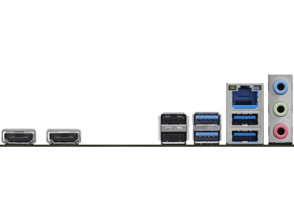 Sieťové pripojenie zabezpečuje Realtek Gigabit Ethernet. Zadný panel ponúka obrazové výstupy HDMI a DisplayPort a základnú USB konektivitu pre periférie.