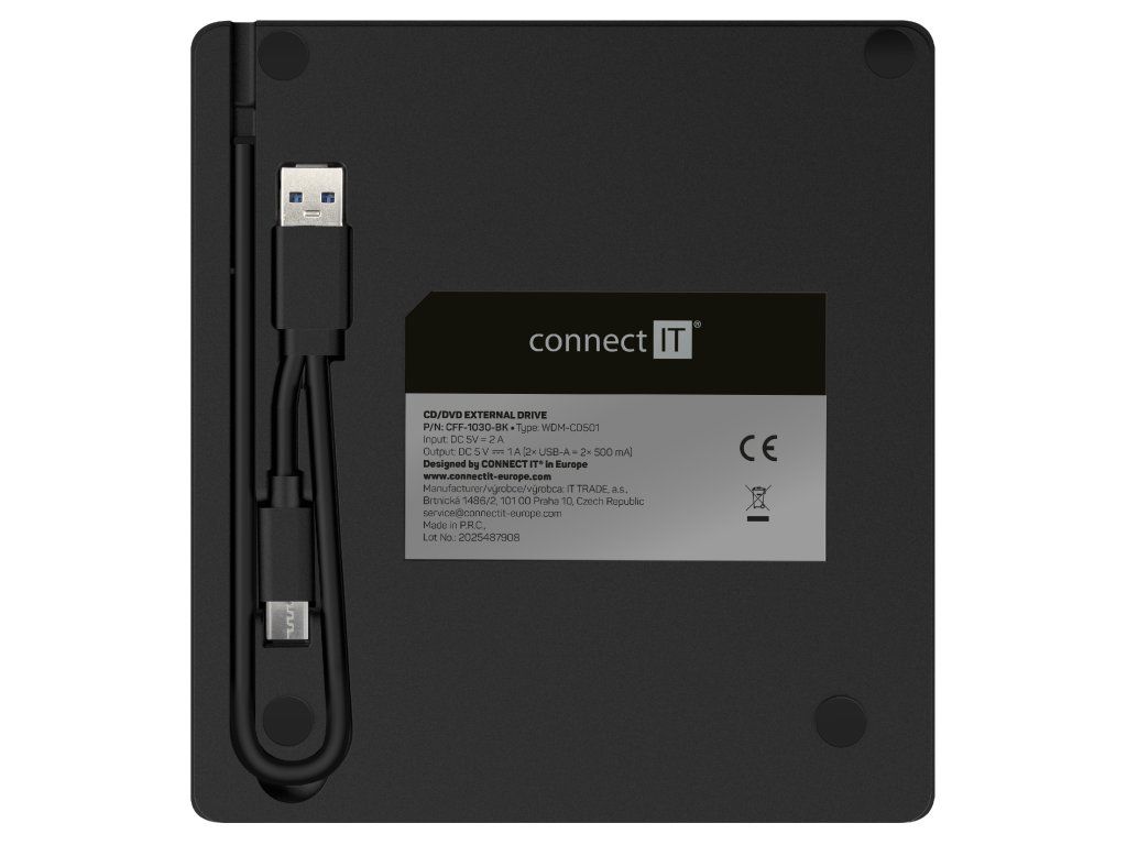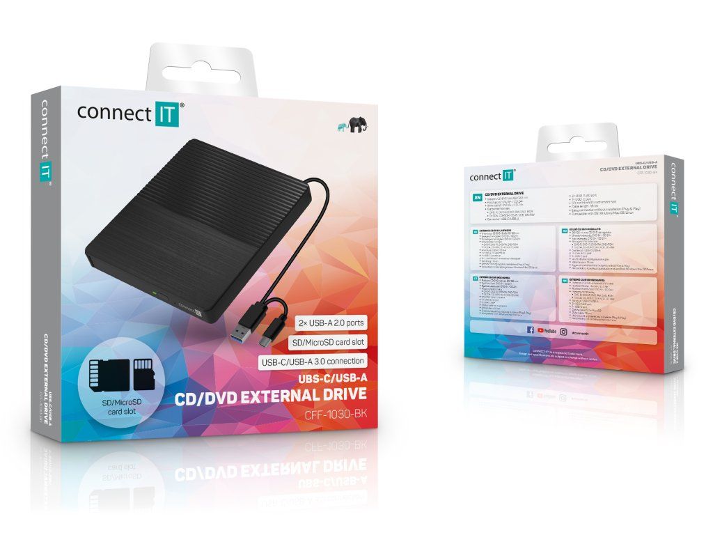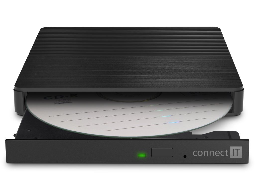 CONNECT IT 3v1 SlimDrive je multifunkčné zariadenie, ktoré kombinuje externú CD/DVD mechaniku, čítačku pamäťových kariet a USB hub. Je ideálnym riešením pre moderné notebooky a ultrabooky bez optickej mechaniky.