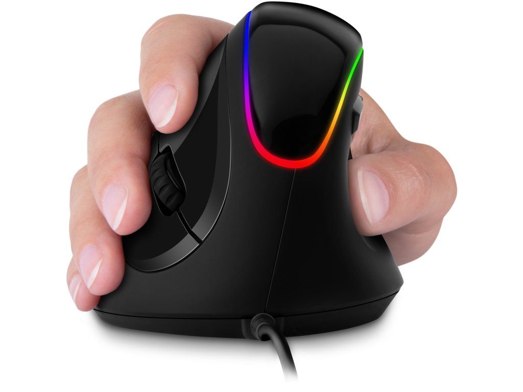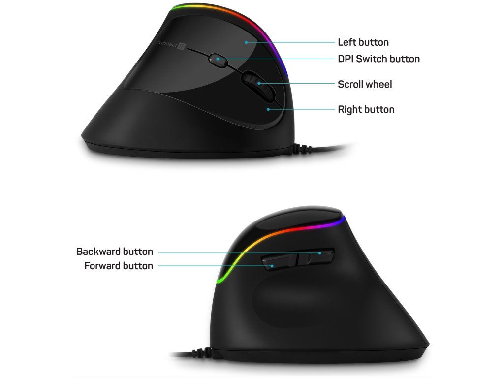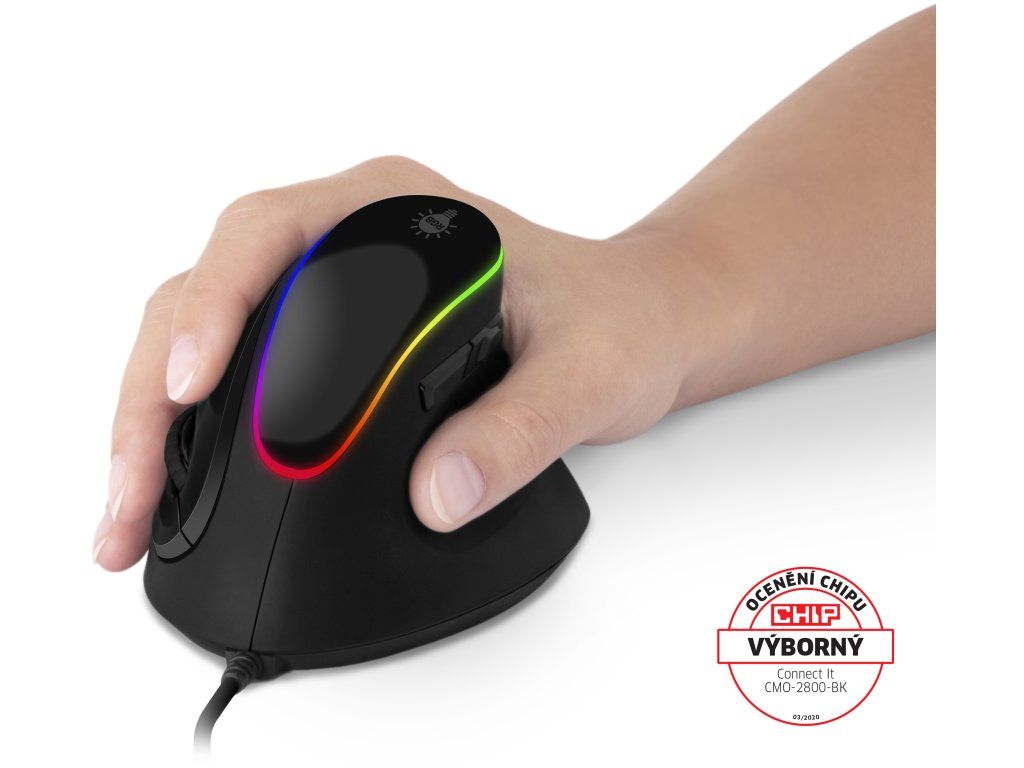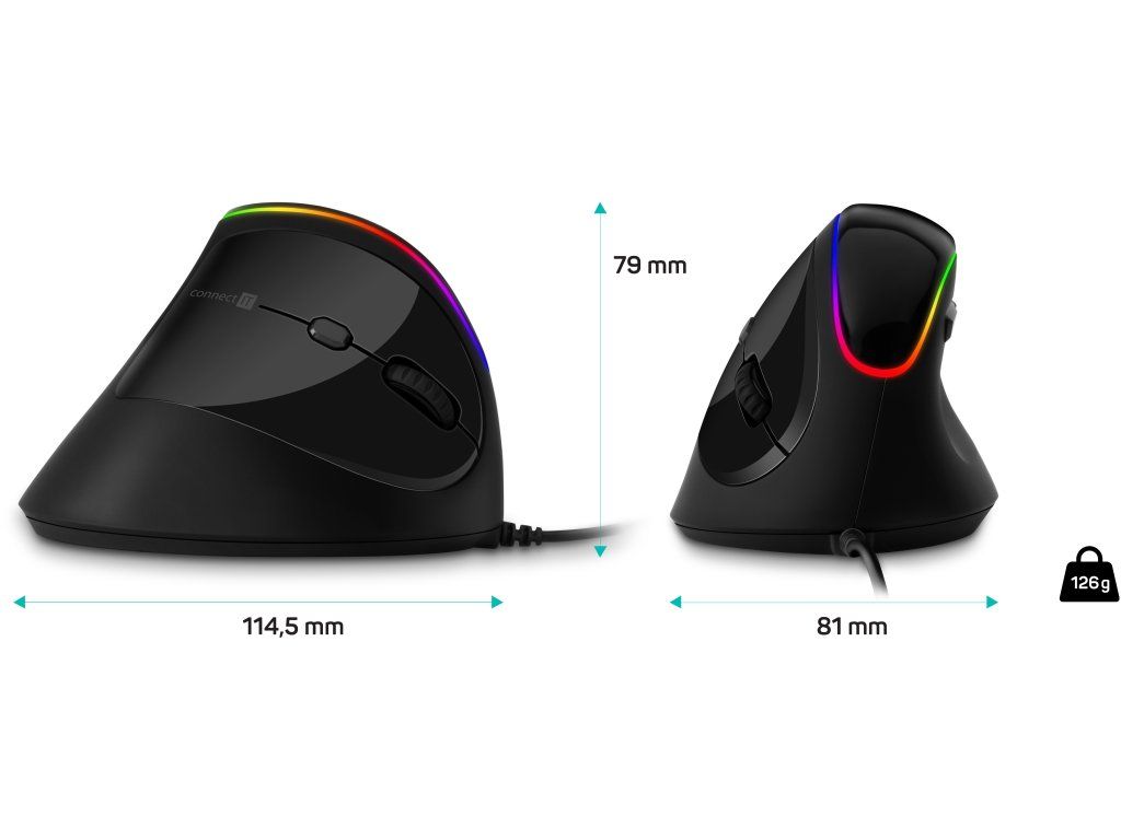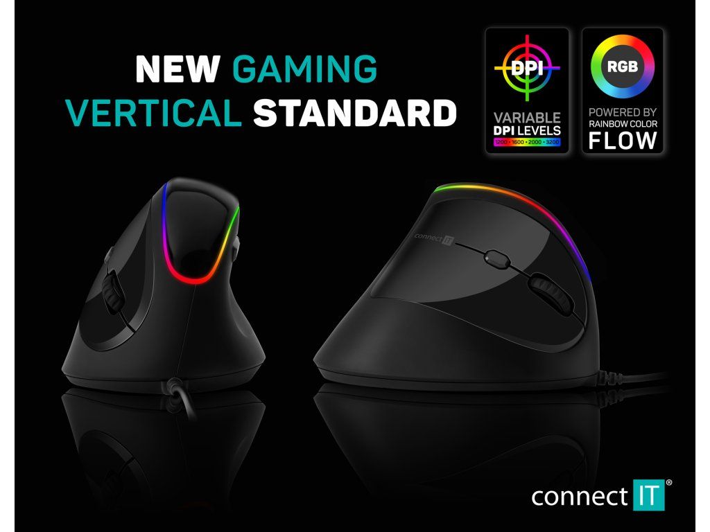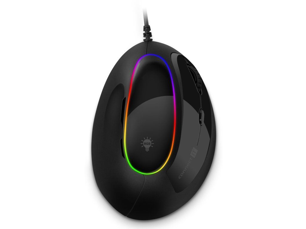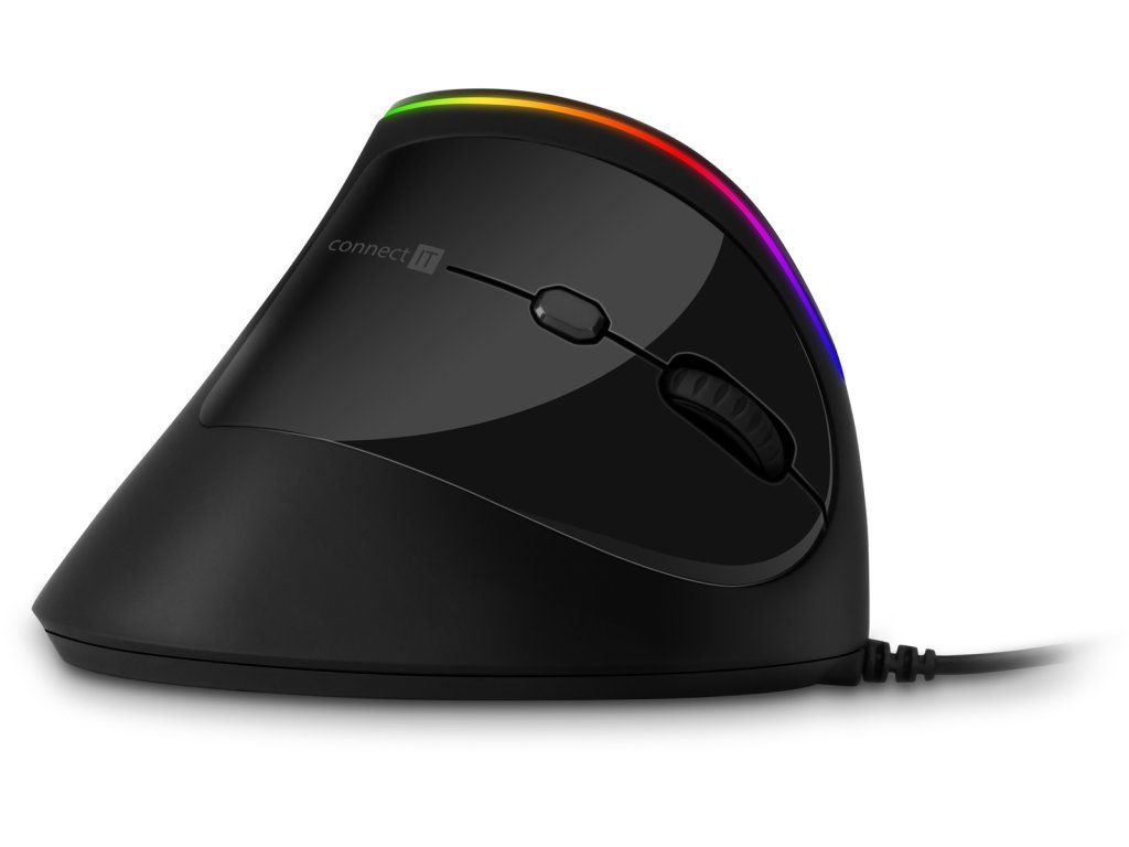 CONNECT IT GAME FOR HEALTH RGB – Black (CMO-2800-BK) je ergonomická herná myš s vertikálnym dizajnom, ktorý podporuje prirodzenú polohu ruky a výrazne znižuje zaťaženie zápästia pri dlhodobom používaní.