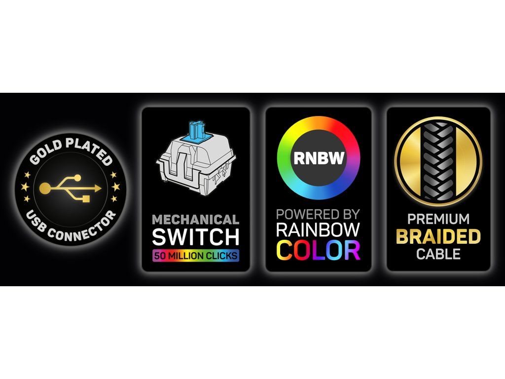 Nechýba RAINBOW LED podsvietenie s celkom 12 režimami, možnosťou regulácie jasu aj rýchlosti efektov a možnosťou úplného vypnutia. Podsvietenie zabezpečuje skvelú viditeľnosť aj v tme.