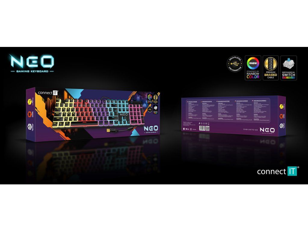 CONNECT IT NEO2 Mechanical Keyboard CZ/SK je mechanická herná klávesnica s RAINBOW podsvietením, multimediálnym kolieskom, 12 funkčnými...