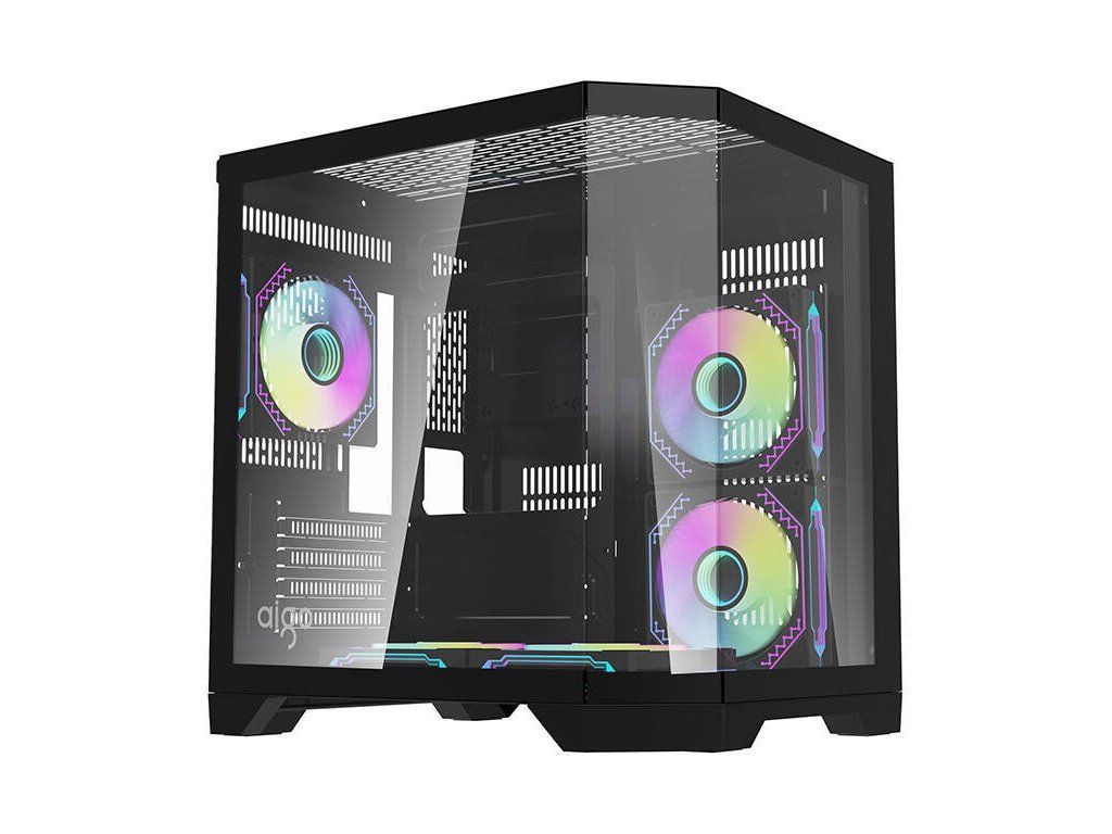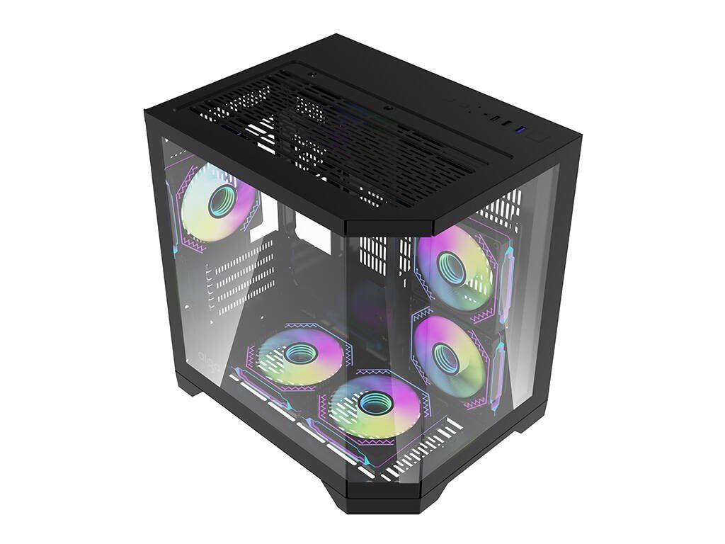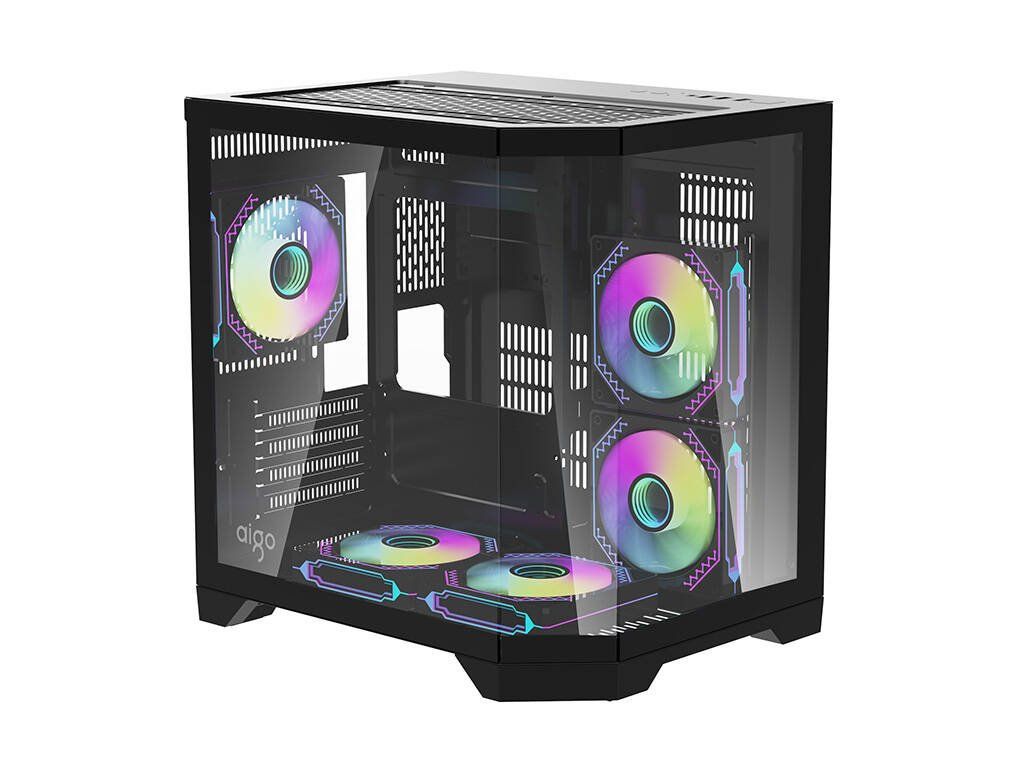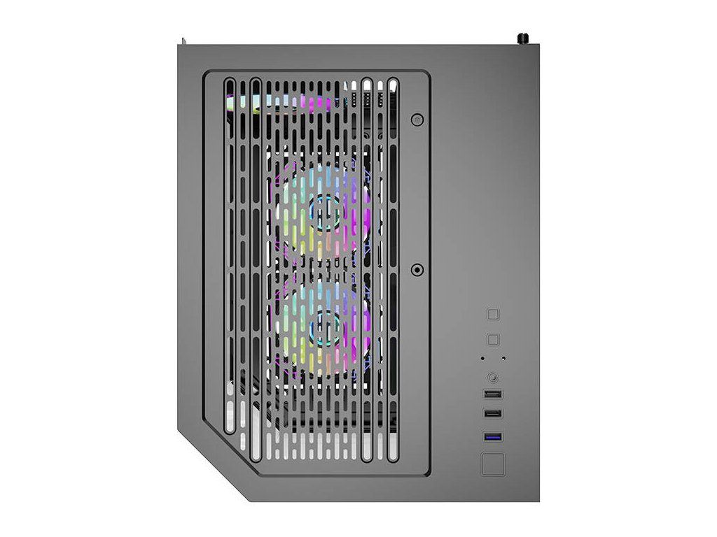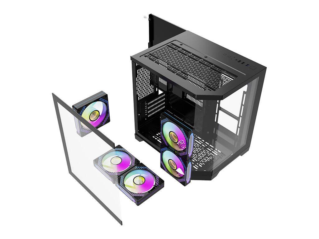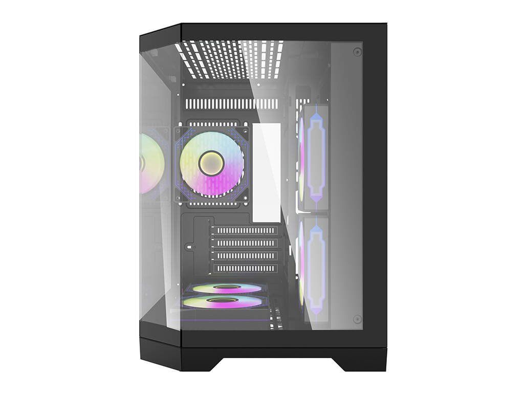 darkFlash FT350 je kompaktná počítačová skrinka navrhnutá pre používateľov, ktorí chcú spojiť atraktívny vzhľad s praktickou kompatibilitou pre hernú aj pracovnú zostavu. Trojica panelov z tvrdeného skla ponúka výrazný panoramatický pohľad do interiéru, takže dobre vyniknú podsvietené komponenty aj dodávané ARGB ventilátory.