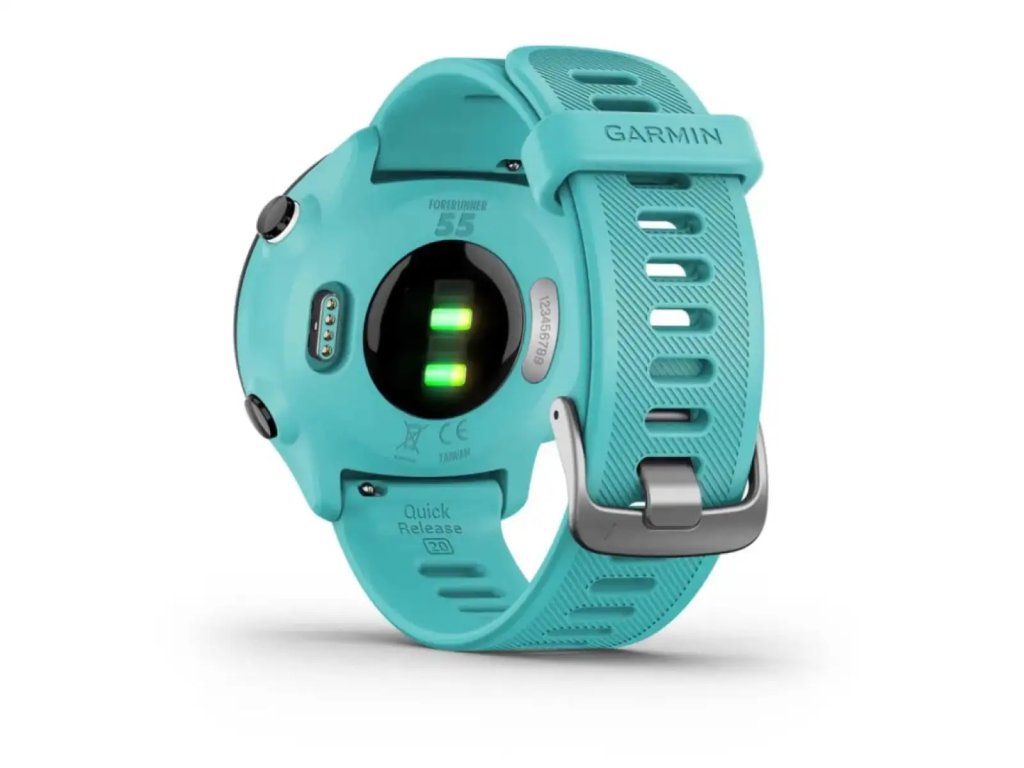 Garmin Forerunner 55 ponúka kompaktné telo s priemerom 42 mm a hmotnosťou len 37 g. Hodinky majú farebný displej s rozlíšením 208 × 208 px, zabudované GPS a výdrž batérie až 14 dní v režime chytrých hodiniek alebo 20 hodín s aktívnym GPS. Funkcie ako Body Battery, VO₂ max, denné tréningové odporúčania, sledovanie spánku a srdcového tepu pomáhajú sledovať celkovú kondíciu. Vodotesnosť 5 ATM umožňuje plávanie a odolnosť pri daždi či sprchovaní. Kompatibilné s aplikáciou Garmin Connect.
