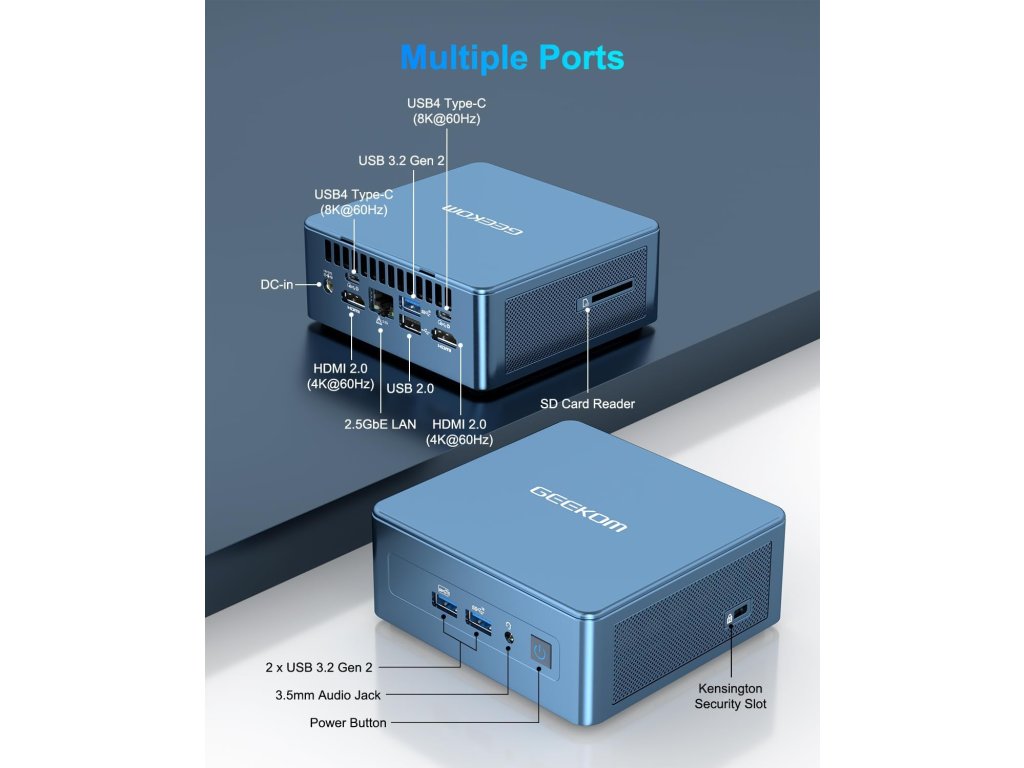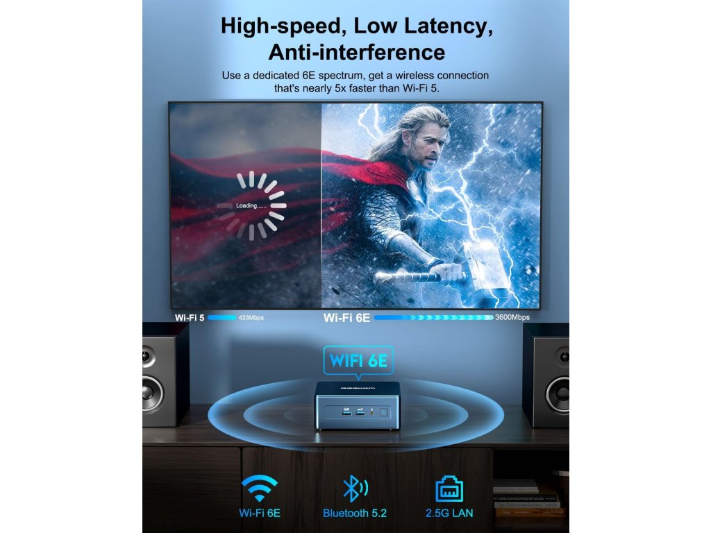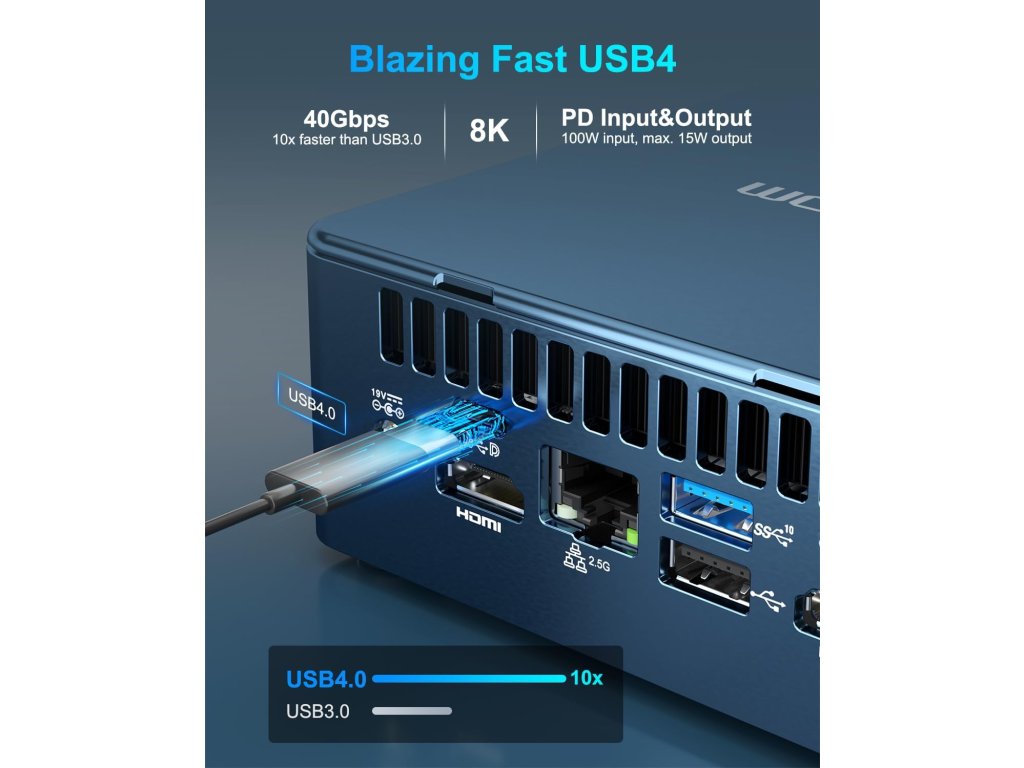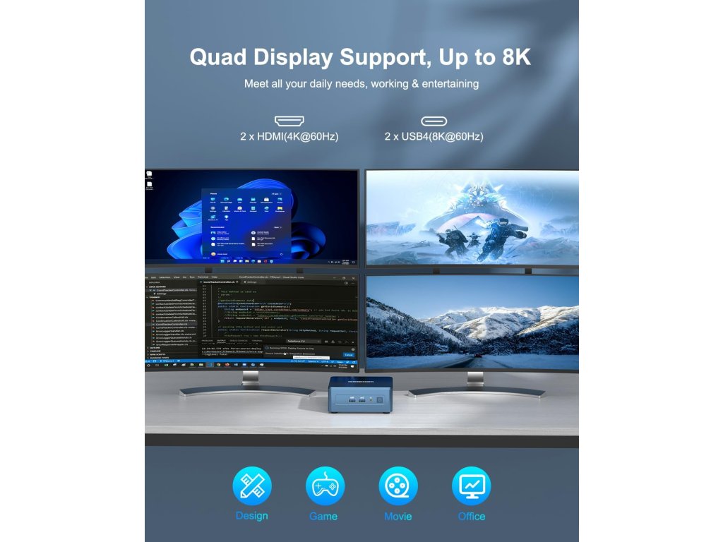 Integrovaná grafika Intel Iris Xe Graphics umožňuje plynulé prehrávanie 4K videí a prácu s viacerými monitormi súčasne. Mini PC ponúka modernú konektorovú výbavu vrátane rýchleho USB-C, USB 4, HDMI a DisplayPortu, podporu Wi-Fi 6E a Bluetooth. Vďaka kompaktným rozmerom, tichému chladeniu a nízkej spotrebe je ideálnou voľbou pre pracovný stôl aj domácu kanceláriu.