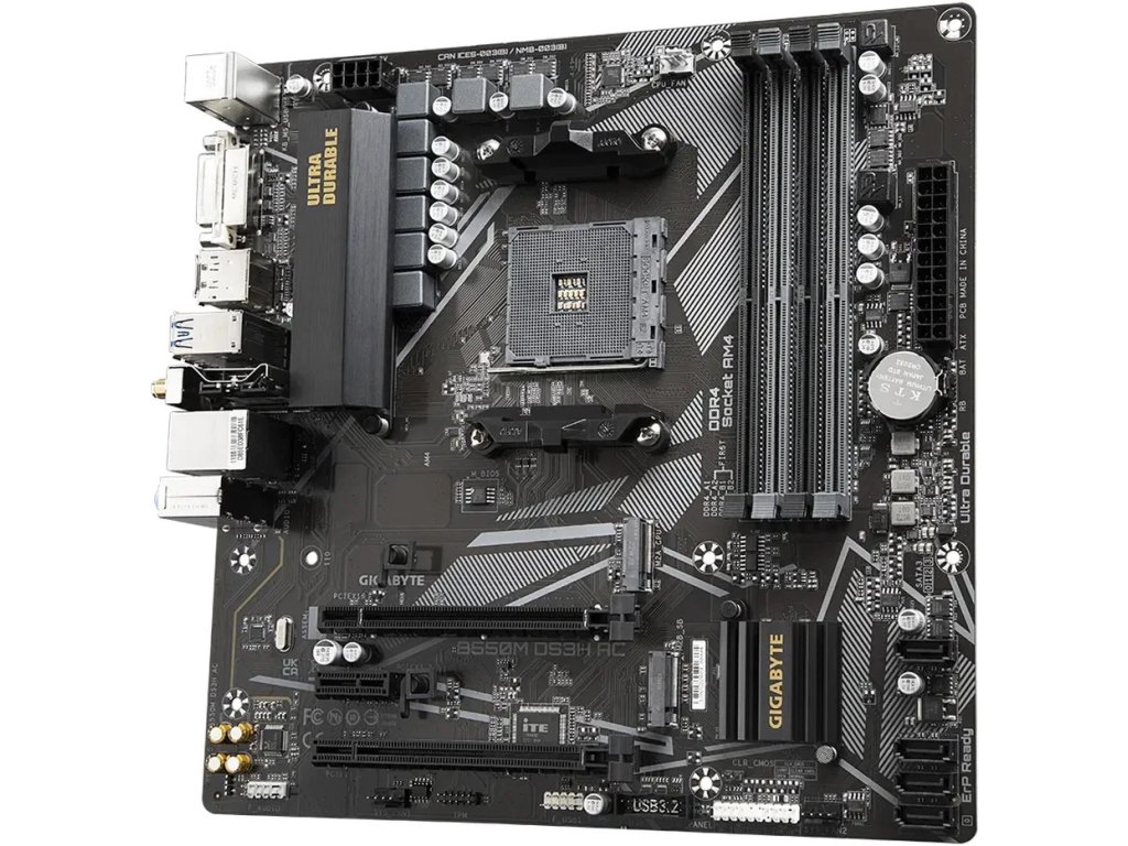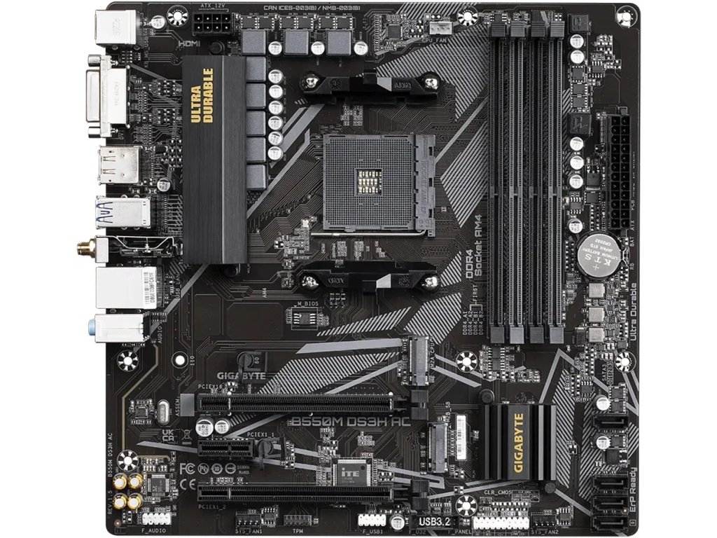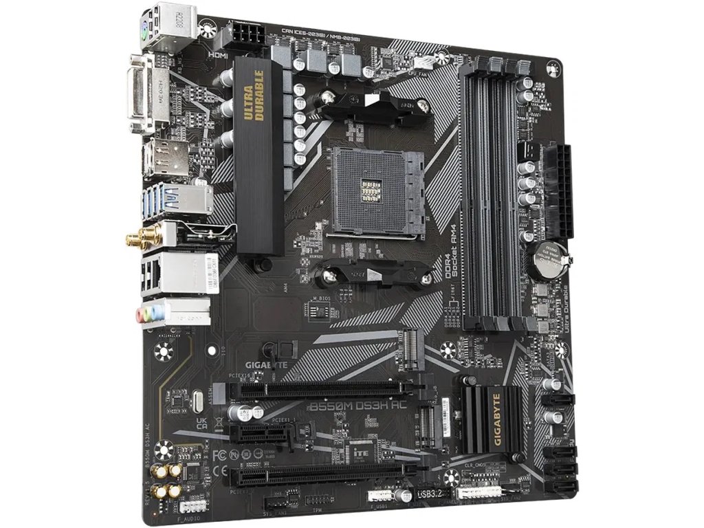 Gigabyte B550M DS3H AC je spoľahlivá základná doska formátu micro ATX s čipsetom AMD B550 a päticou AM4. Určená je pre procesory Ryzen 3000 a 5000 (okrem 3200G a 3400G) a ponúka vyvážený výkon pre domáce aj kancelárske zostavy.