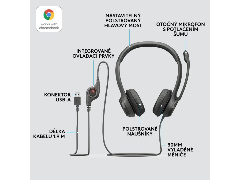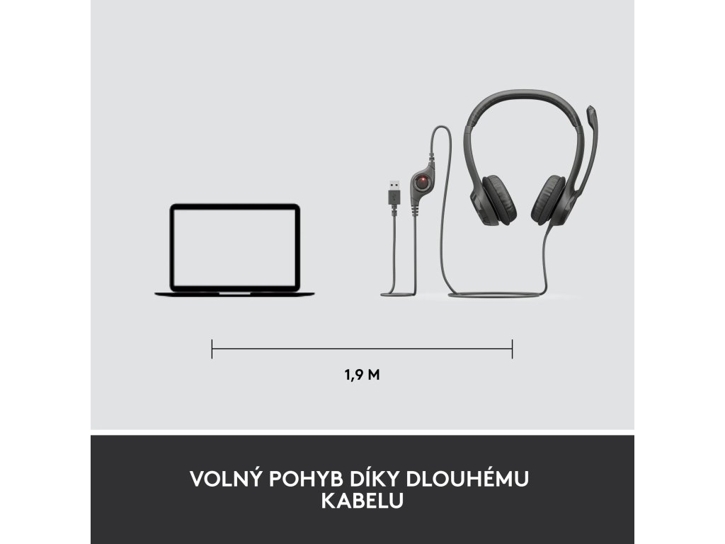 Slúchadlá majú kábel dlhý cca 233 cm, ovládanie hlasitosti a mute na kábli, čo umožňuje jednoduché ovládanie počas hovoru. Mikrofón je otočný a potláča rušivé zvuky z okolia. Skvelé pre kancelárie, home‑office, videohovory či online výučbu.