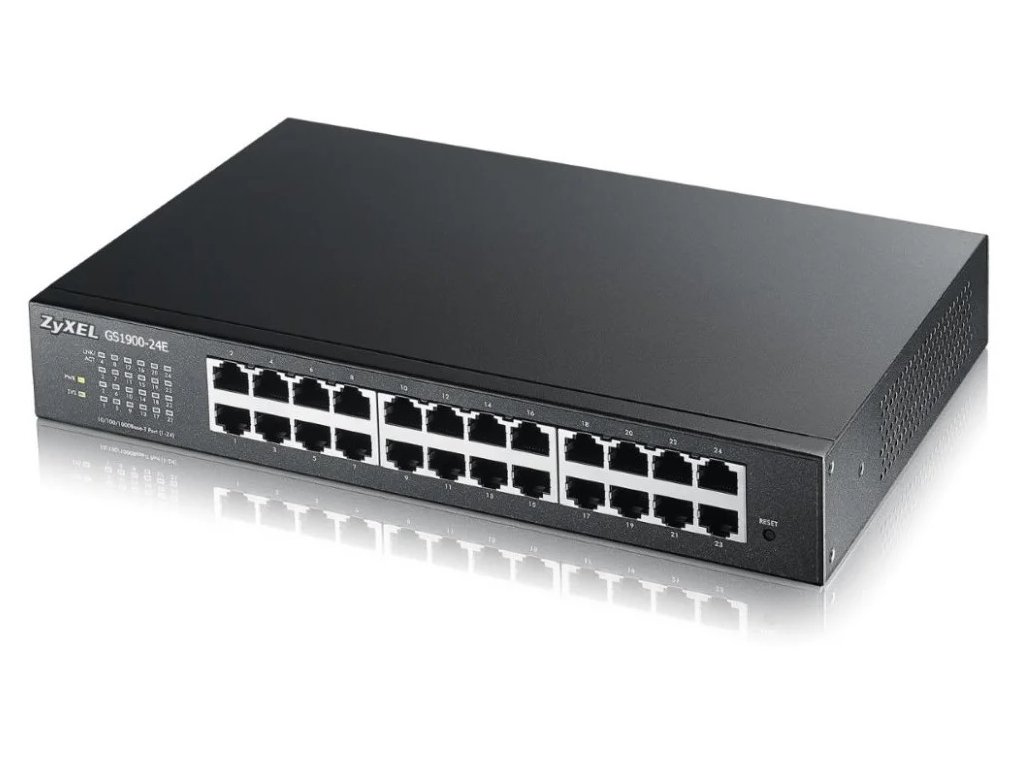 Zyxel GS1900-24E v3 – 24-portový Gigabit Smart Managed L2 Switch (model GS1900-24E-EU0103F) poskytuje vysoký výkon a funkcie vhodné pre profesionálne nasadenie. Má 24 Gigabitových portov (10/100/1000 Mbps), prepínaciu kapacitu 48 Gbps a forwarding rate cca 35,7 Mpps. Systém je spravovateľný, umožňuje konfiguráciu VLAN, QoS, LACP, IGMP snooping alebo port mirroring.